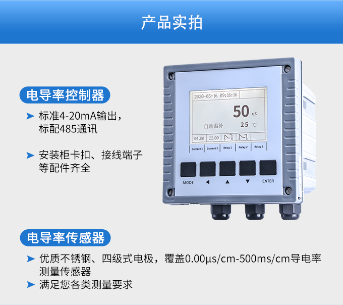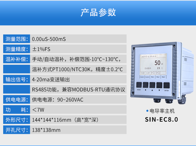 SIN-EC8.0工業(yè)電導率儀表,大屏顯示,可對各種工業(yè)用水的電導率(TDS)值進行連續(xù)測量和控制。根據水工業(yè)的環(huán)境和特點結合國際供電標準,考慮了特殊環(huán)境的電氣設計規(guī)范,增加了220VAC供電。