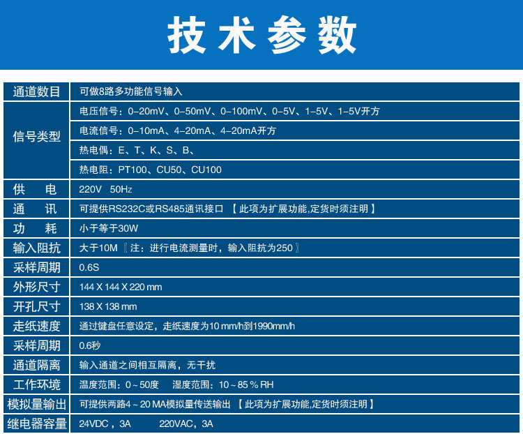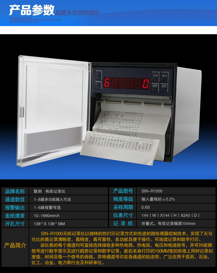SIN-R1000有紙溫度記錄儀最多具有8路輸入通道,2路模擬量輸出,通道之間采用點(diǎn)點(diǎn)隔離;均可直接選擇接收多種熱電偶、熱電阻、壓力變送器、電壓、電流信號(hào)。